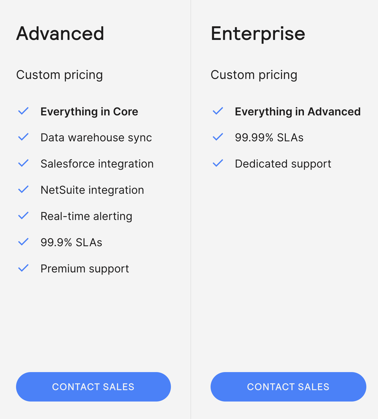 Orb’s pricing is structured around three tiers: Core, Advanced, and Enterprise. Core focuses on getting started small-medium sized companies while Enterprise is a custom plan for a larger organization.